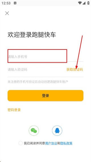 3、在登录界面输入需要登录的手机号,点击获取验证码。