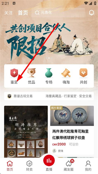 1、在首页,点击鉴定,进入古玩鉴定页面。