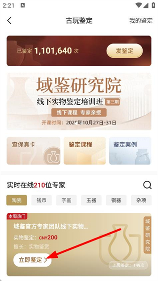 2、在古玩鉴定页面,点击立即鉴定,进入鉴定操作页面。