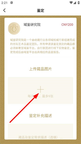 3、随后我们可以在鉴定页面,点击+的符号,上传藏品图片。