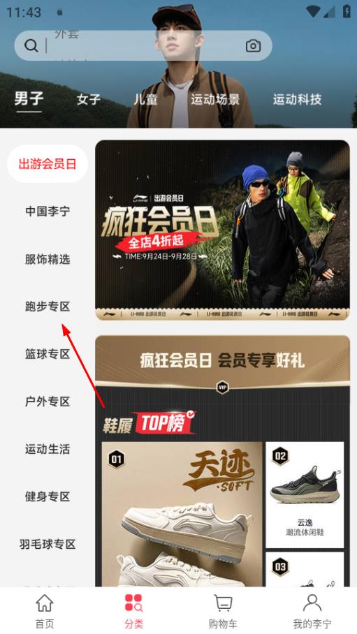 2、在分类页面,若想查看跑步相关商品,可点击跑步专区。