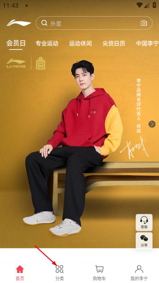 1、进入李宁首页,若要查看商品分类,可点击页面下方的分类按钮。
