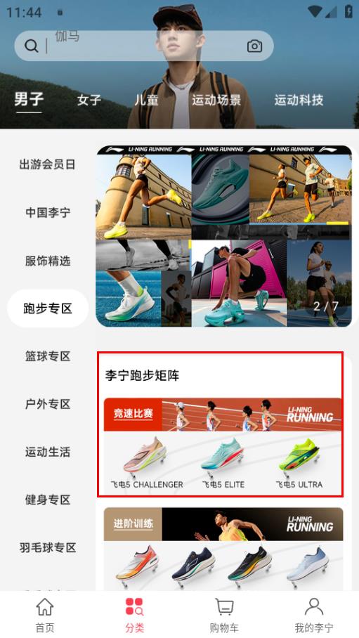 3、进入跑步专区后,若对李宁跑步矩阵下的商品感兴趣,可点击对应的商品区域。