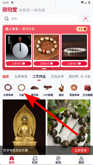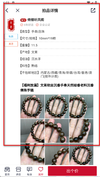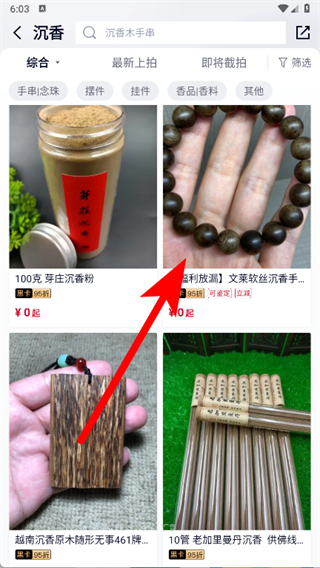 3、进入沉香类商品列表后,点击感兴趣的拍品,进入拍品详情页。