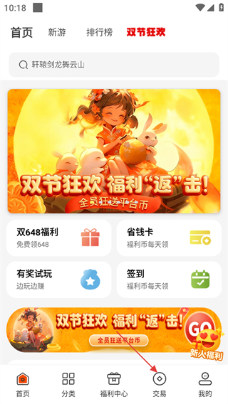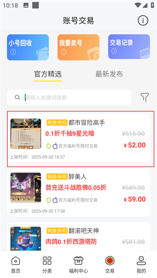 1、点击嗨玩游戏首页底部的交易,进入账号交易页面。