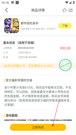 3、在商品详情页面,点击立即购买,即可购买该账号完成交易。