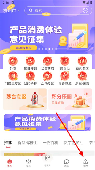 1、打开香溢家app,点击底部导航栏中的我的选项。