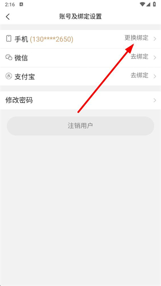 4、在账号及绑定设置页面,点击手机选项右侧的更换绑定。