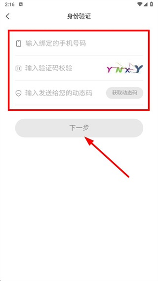 5、在身份验证页面输入相关信息并获取动态码,输入后点击下一步,按提示完成新手机号绑定。