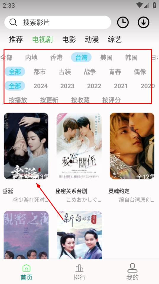 2、在电视剧分类页面,通过筛选条件找到想看的电视剧,如垂涎,点击进入播放页面。