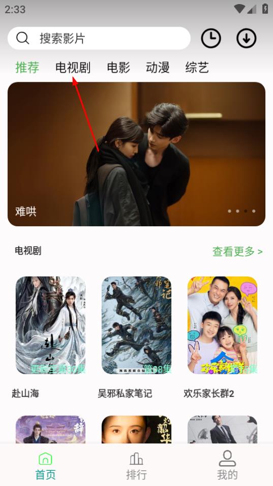1、查找目标影视:打开应用后,可在首页推荐区浏览热门内容,或点击顶部分类栏如电视剧,筛选品类,也可通过搜索栏输入影视名称,快速定位目标资源。