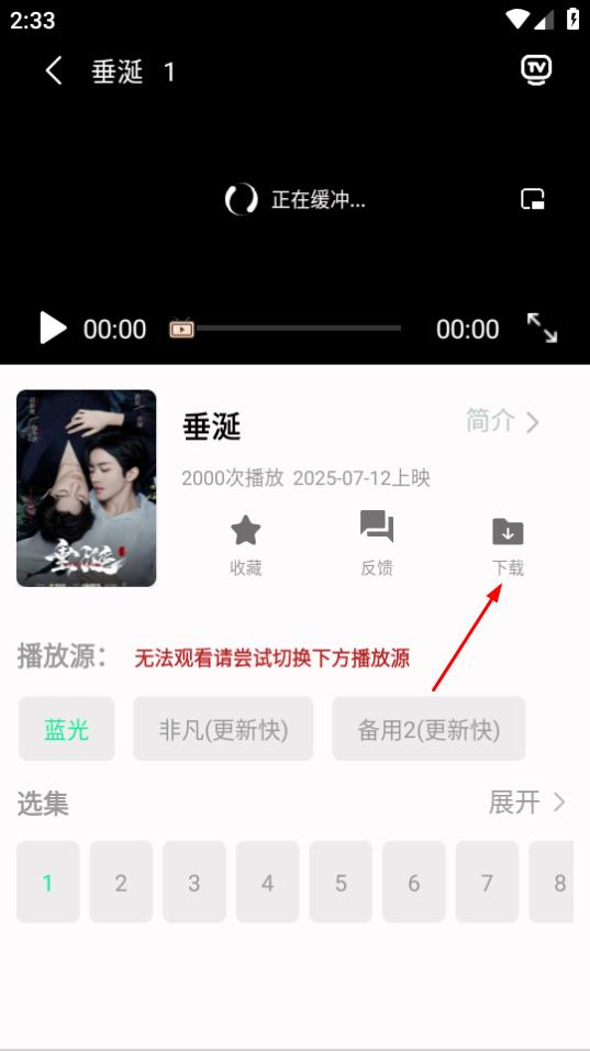 3、在电视剧播放页面,点击下载,进入剧集选择下载页面。