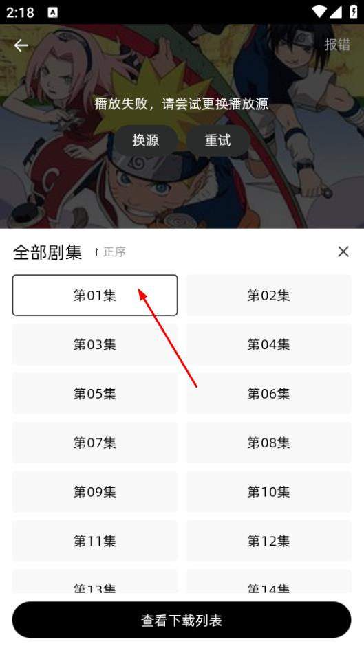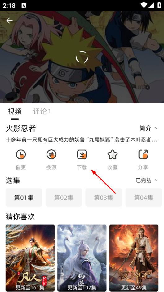 3、在火影忍者播放页面,点击下载,选择要下载的剧集。