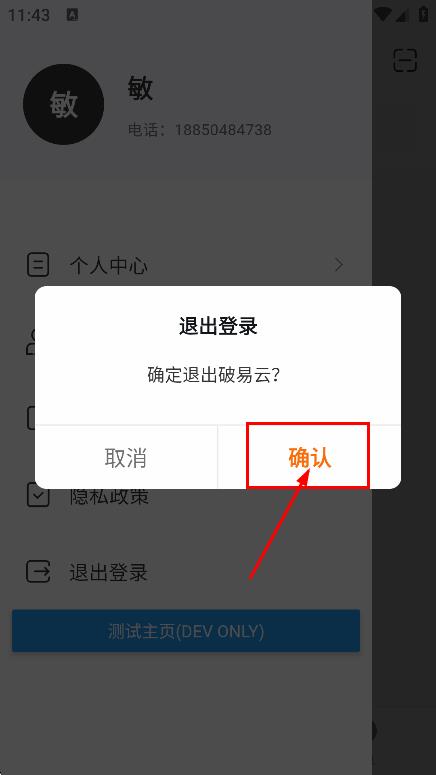 4、在退出登录确认弹窗中,点击确认,退出破易云登录。