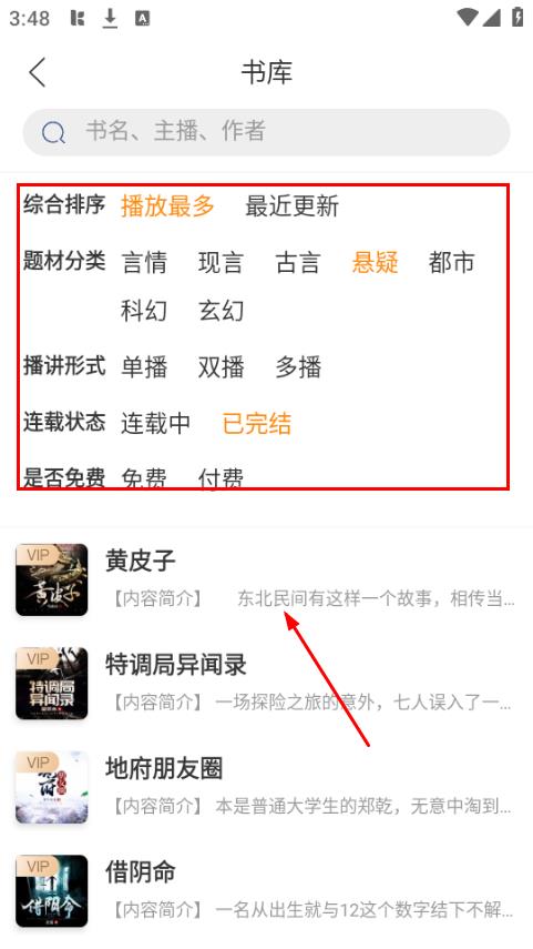 1、打开夜听书城,点击页面右上角的筛选图标,进入书库筛选页面。