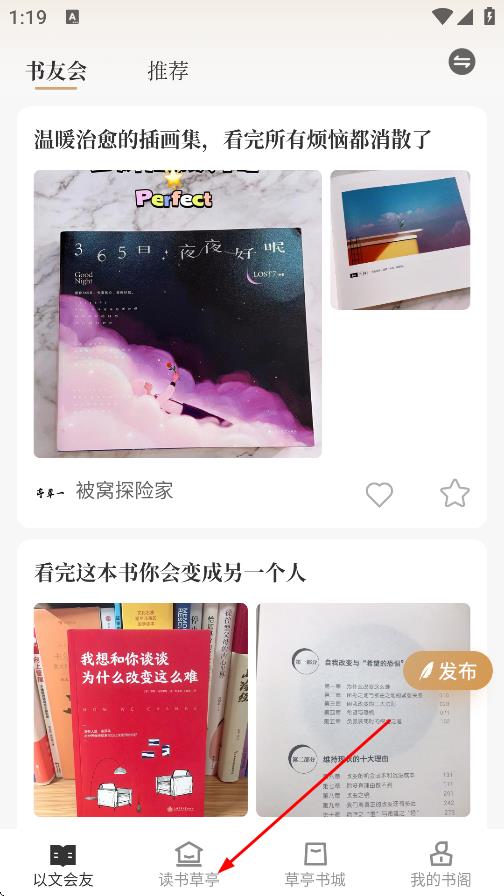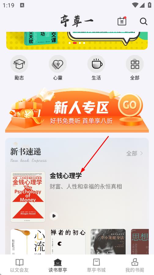 2、在一草亭读书主页面,点击读书草亭,进入读书草亭页面。