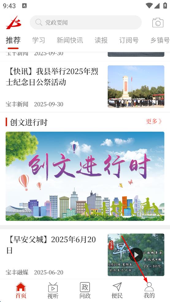 1、打开宝丰融媒App,进入主界面后,点击底部功能栏最右侧我的选项。