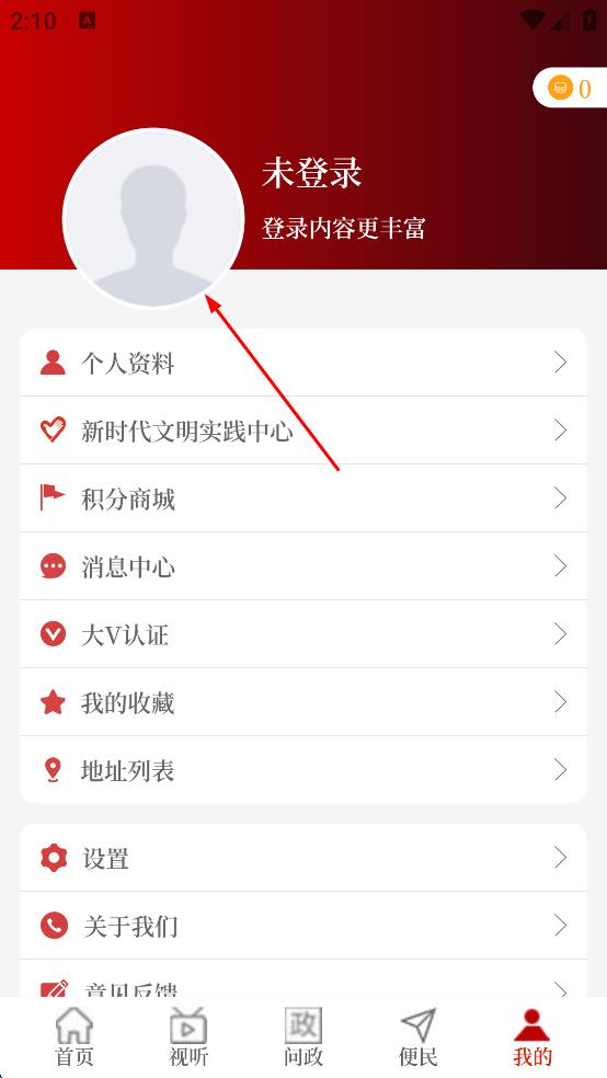 2、在“我的”页面,点击头像区域,进入登录页面。