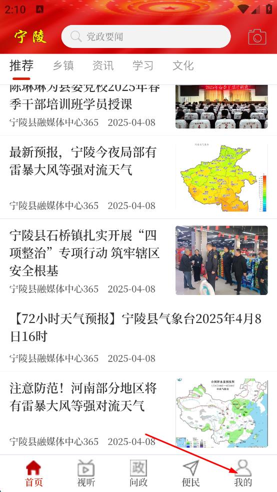 1、打开宁陵融媒体APP,进入首页后,点击页面右下角的“我的”按钮。