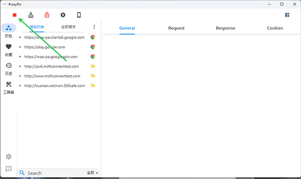 1、先说明不管是普通 http 抓包,还是 https 抓包,打开软件就会自动抓包,点顶部红色按钮能终止操作。