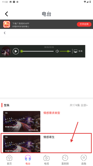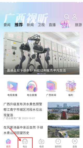 1、打开广西视听应用,点击底部电台选项,进入电台内容页面。