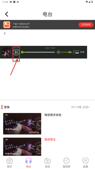 4、点击播放控制区域的暂停按钮,可暂停当前播放的电台节目。