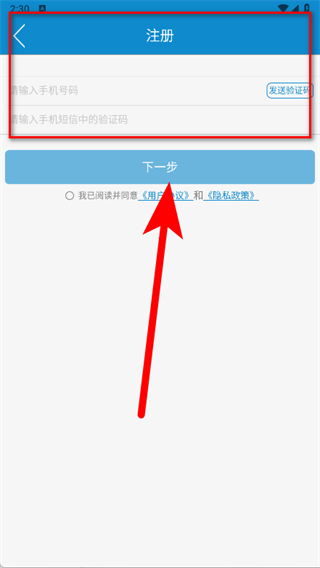 4、输入手机号码,点击发送验证码并填写收到的验证码,勾选后点击下一步。