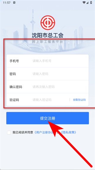 4、在注册页面,填写手机号,获取并输入验证码等,勾选后点击提交注册。
