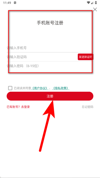 4、在手机账号注册页面,输入手机号、验证码、密码,勾选后点击注册,完成注册。