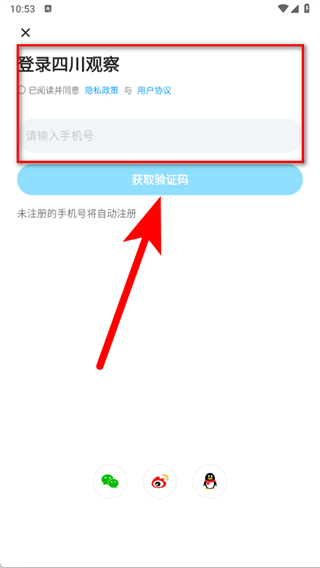 3、进入登录四川观察页面,勾选后,输入手机号后,点击获取验证码。