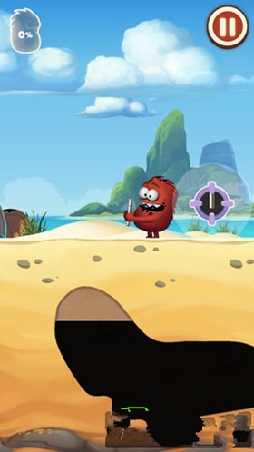 1、小怪物出来的时候,手里会拿着一个可以伸缩的导管,有些像孙悟空的如意金箍棒一样,我们来到有石油的上方,按住屏幕中出现的按钮,就可以让导管边长。